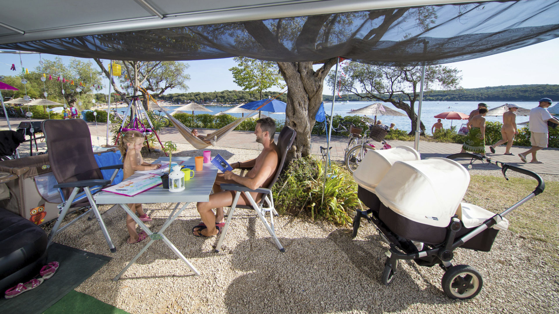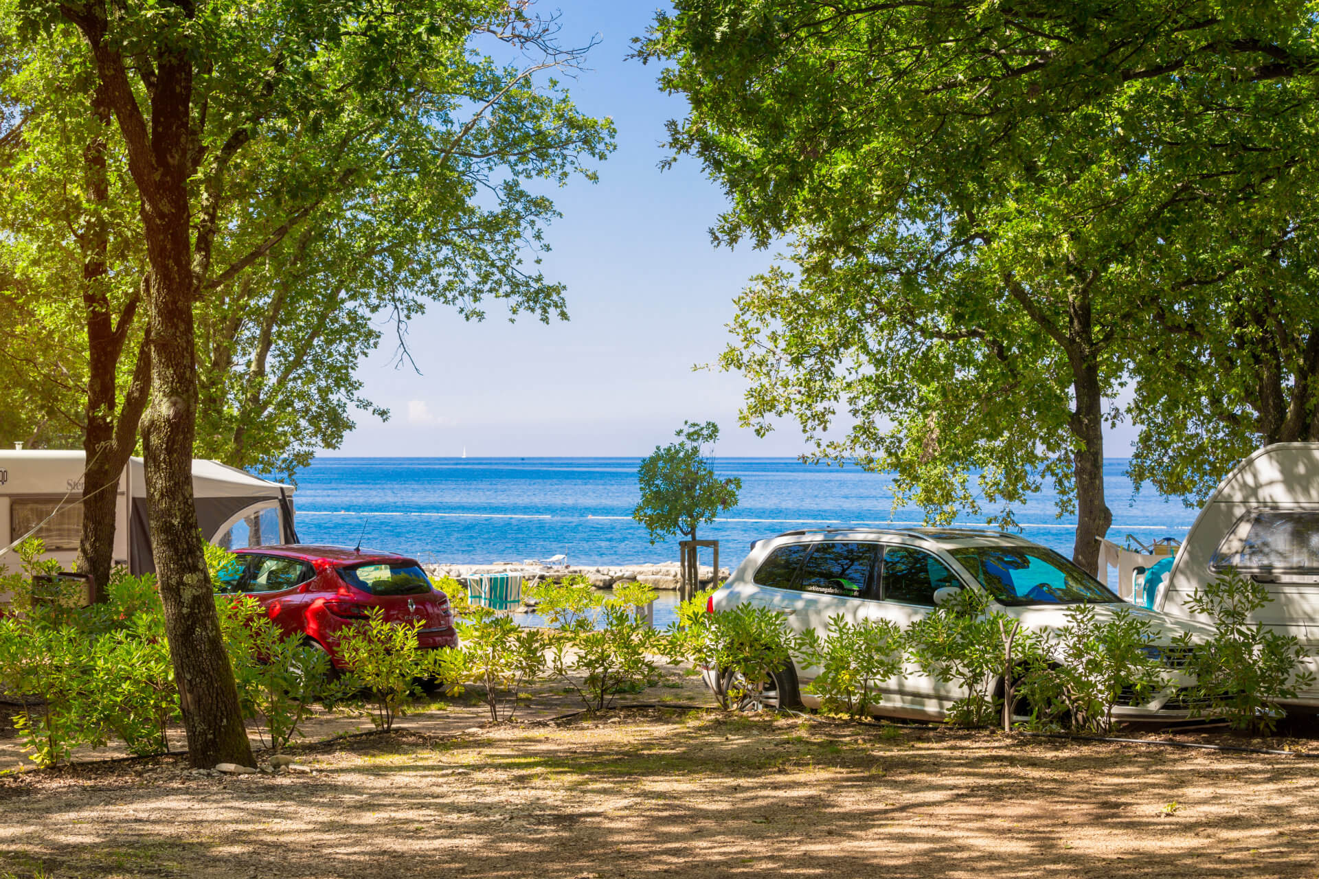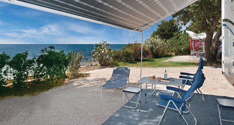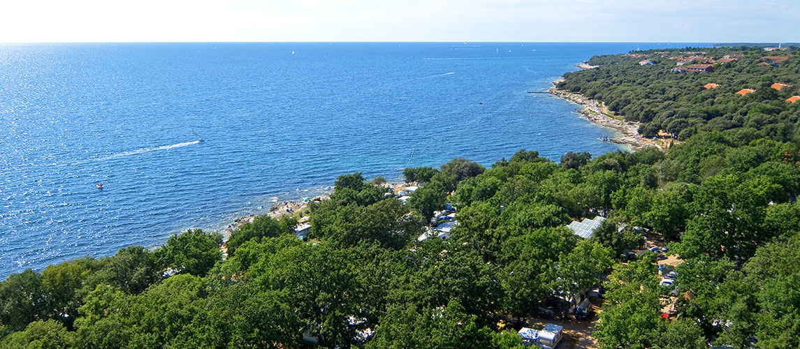 As the only naturist campsite in northwestern Istria, Camping Kanegra near Umag is a retreat back to nature. Nestled close to the border of Slovenia, you can enjoy this naturist campsite in Croatia with everyday views of the Portorož skyline. State-of-the-art pitches, campsite infrastructure, and the nearby Kanegra apartments guarantee a stellar experience right next to the sea. Because the campsite has an ideal location and is secluded, you can enjoy your holiday in the shadows of Mediterranean greenery and swim in the clear sea of the campsite’s pebble beach.